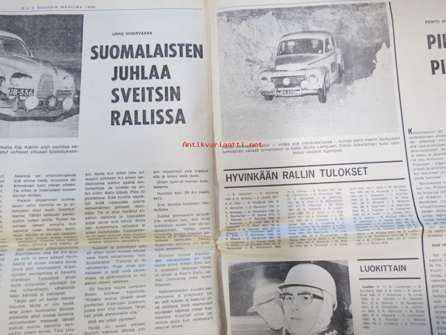 Vauhdin maailma 1966 nr 2, sis. mm. seur. artikkelit / kuvat / mainokset; Ranskalaislehti Monte Carlon jälkeen Timo Mäkinen Le Vrai Vainqueur, Timo Mäkisen
