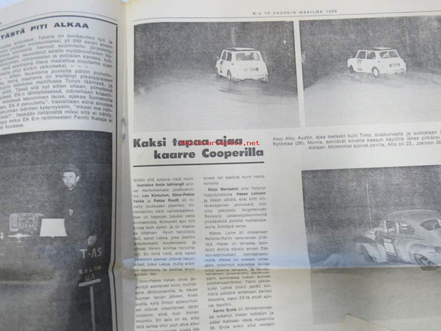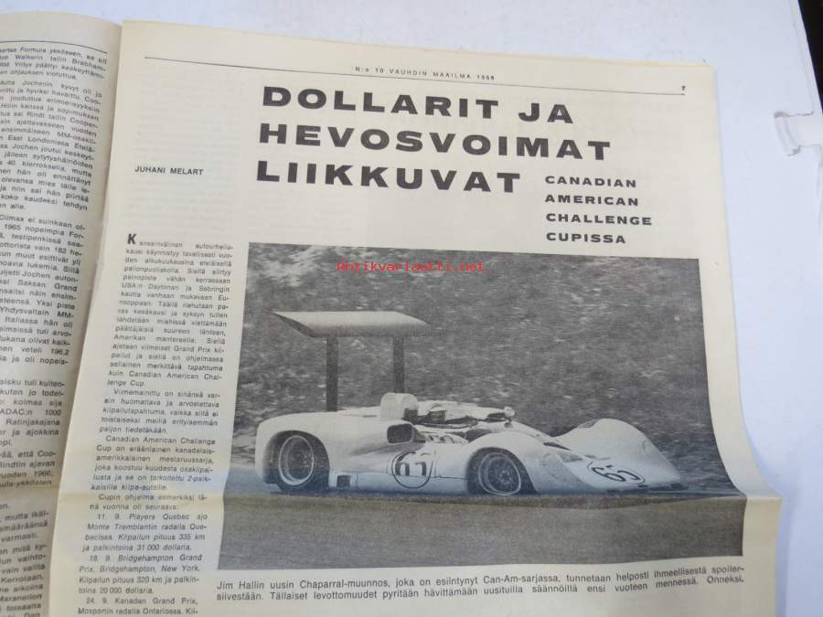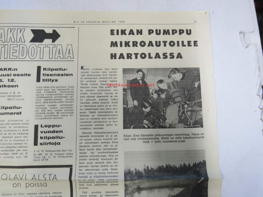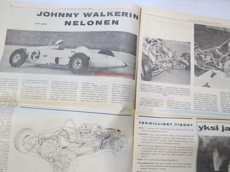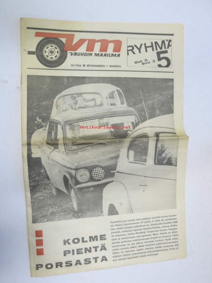Vauhdin maailma 1966 nr 10, sis. mm. seur. artikkelit / kuvat / mainokset;Angliat ja Cooperit ratkotaan Englannin vakioautomestaruus, Johnny Walkerin nelonen tekniset tiedot ja piirustus, Jochen Rindt uusi Berndt Rosemayer, Canadian American Challenge Cupissa - Dollarit ja hevosvoimat liikkuvat, Tampereen seudun virityspaja Turunen & Hanhineva, 19 kuvaa ja 3 kertomusta Helsinki-rallista, Kuopion kasvot Jouko Hartikainen - Matti Oksanen - Pentti Laine, Liikenneruuhkaa Nummelan metsässä, katso sisältö kuvista tarkemmin. 27 x 42 cm.