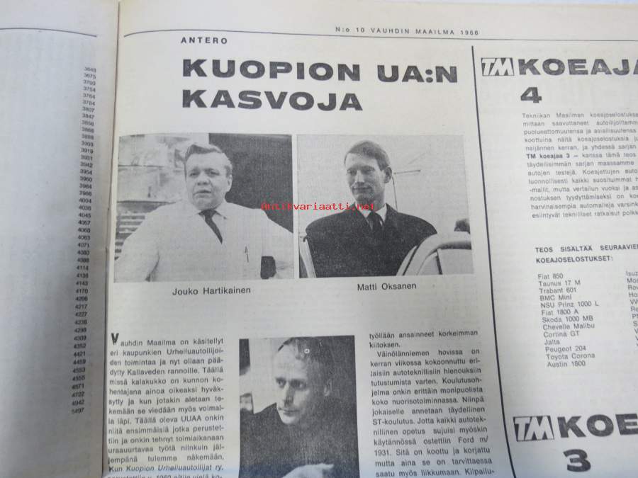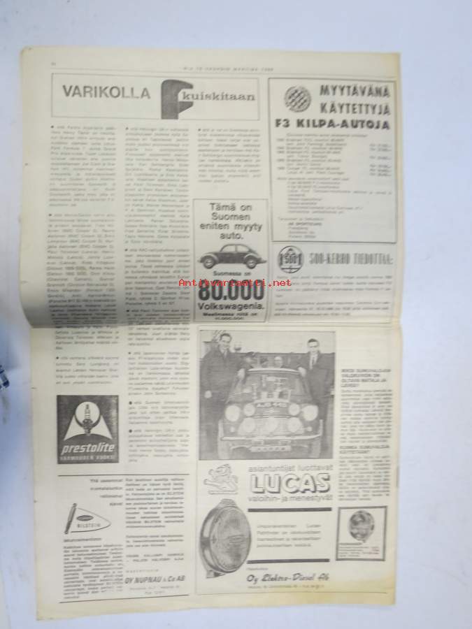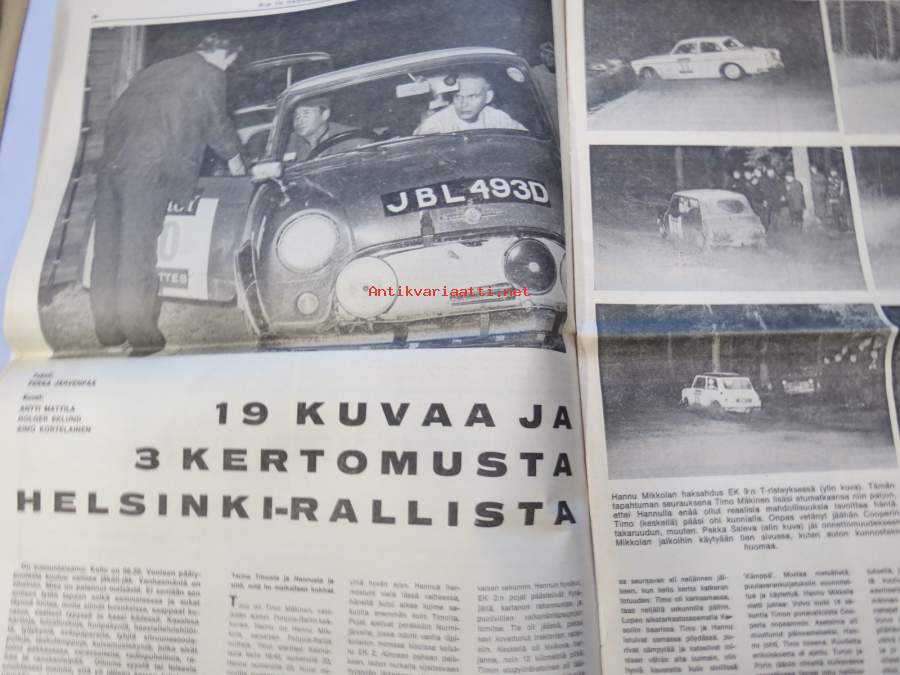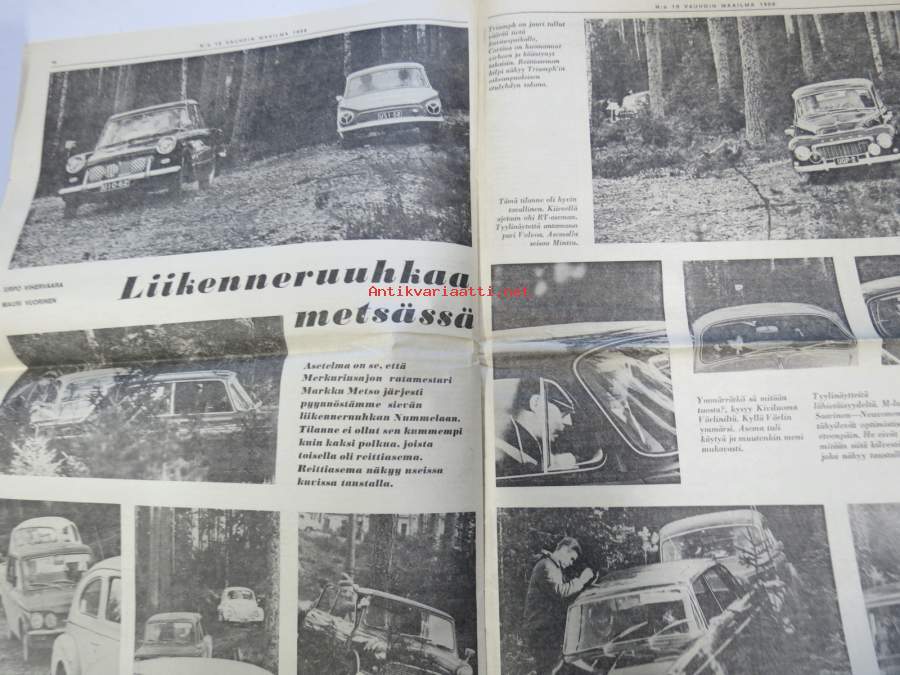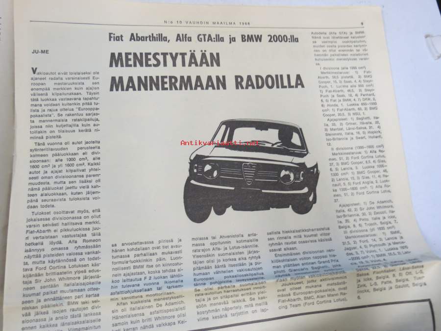 Vauhdin maailma 1966 nr 10, sis. mm. seur. artikkelit / kuvat / mainokset;Angliat ja Cooperit ratkotaan Englannin vakioautomestaruus, Johnny Walkerin nelonen tekniset tiedot ja piirustus, Jochen Rindt uusi Berndt Rosemayer, Canadian American Challenge Cupissa - Dollarit ja hevosvoimat liikkuvat, Tampereen seudun virityspaja Turunen & Hanhineva, 19 kuvaa ja 3 kertomusta Helsinki-rallista, Kuopion kasvot Jouko Hartikainen - Matti Oksanen - Pentti Laine, Liikenneruuhkaa Nummelan metsässä, katso sisältö kuvista tarkemmin. 27 x 42 cm.