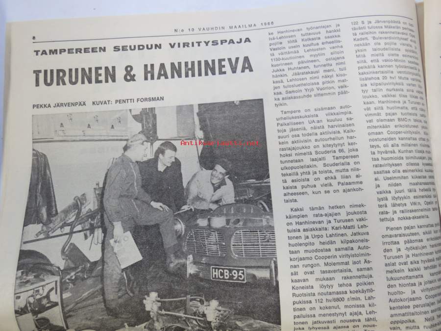 Vauhdin maailma 1966 nr 10, sis. mm. seur. artikkelit / kuvat / mainokset;Angliat ja Cooperit ratkotaan Englannin vakioautomestaruus, Johnny Walkerin nelonen