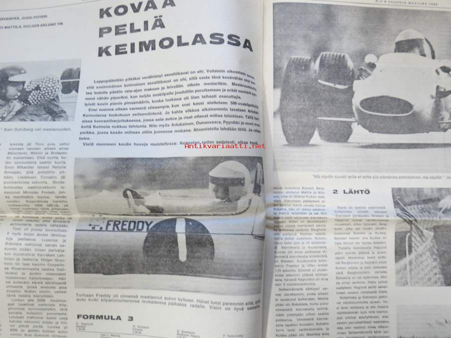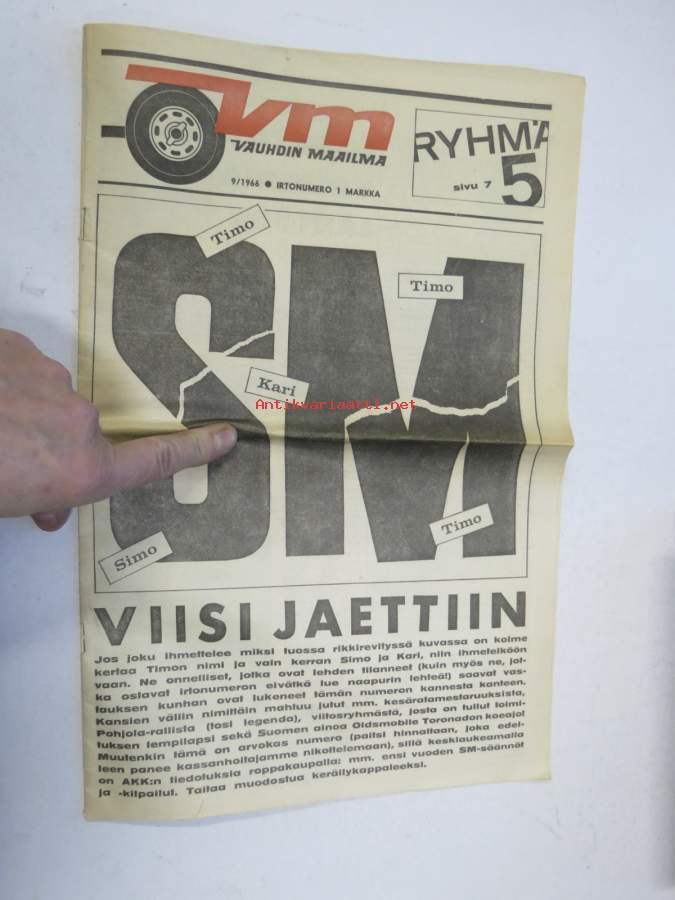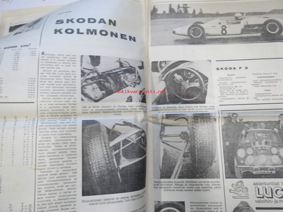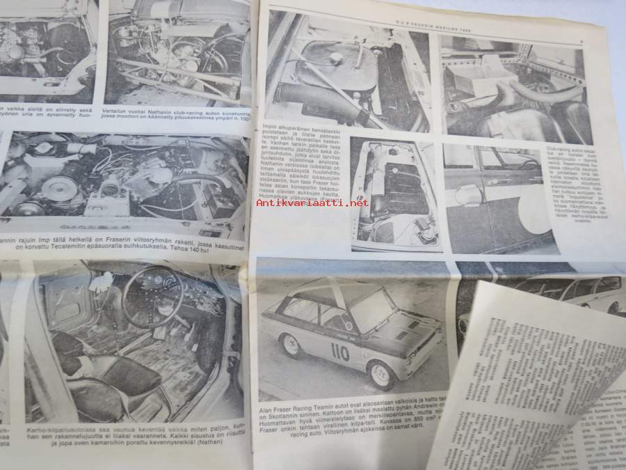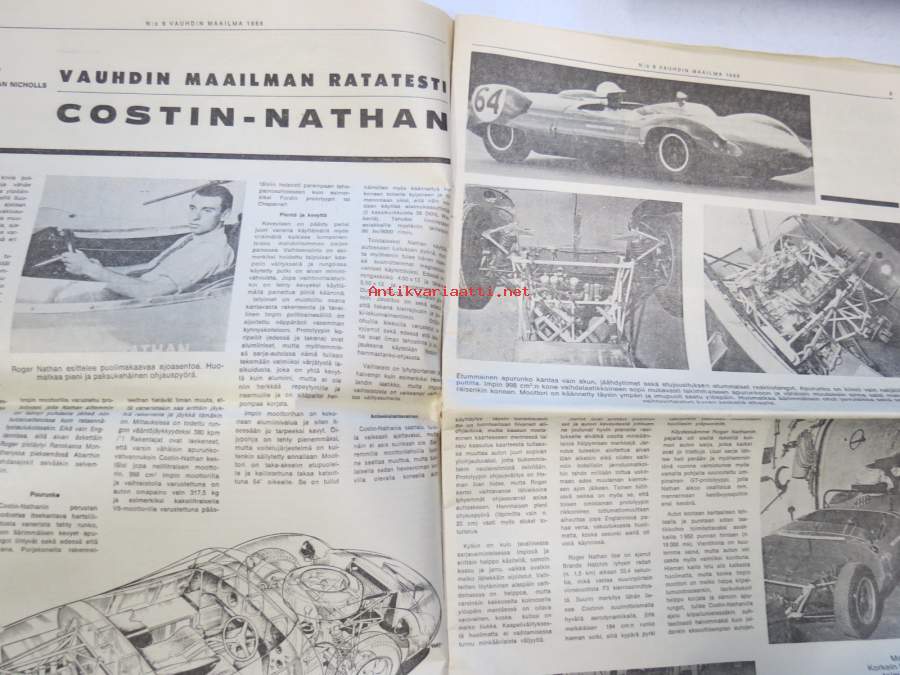Vauhdin maailma 1966 nr 9, sis. mm. seur. artikkelit / kuvat / mainokset; Uusi Formula 2 Ford-Cosford valmiina lähtöön, Vauhdin maailman ratatesti Costin-Nathan, Pahankurinen luokka Roger Nathan ja Alan Fraser, Formula GP:t Yhdysvallat ja Meksiko Jim John ja Jack, Pohjola-ralli pähkinäkuoressa, Vauhdin Maailman koeajo Oldsmobile Toronado, Formula 3 kovaa peliä Keimolassa, Skodan F3, Kuukauden profiili Hannu Mikkola, katso sisältö kuvista tarkemmin. 27 x 42 cm.