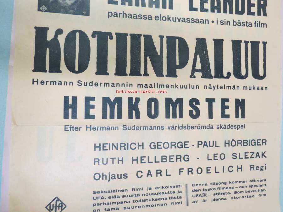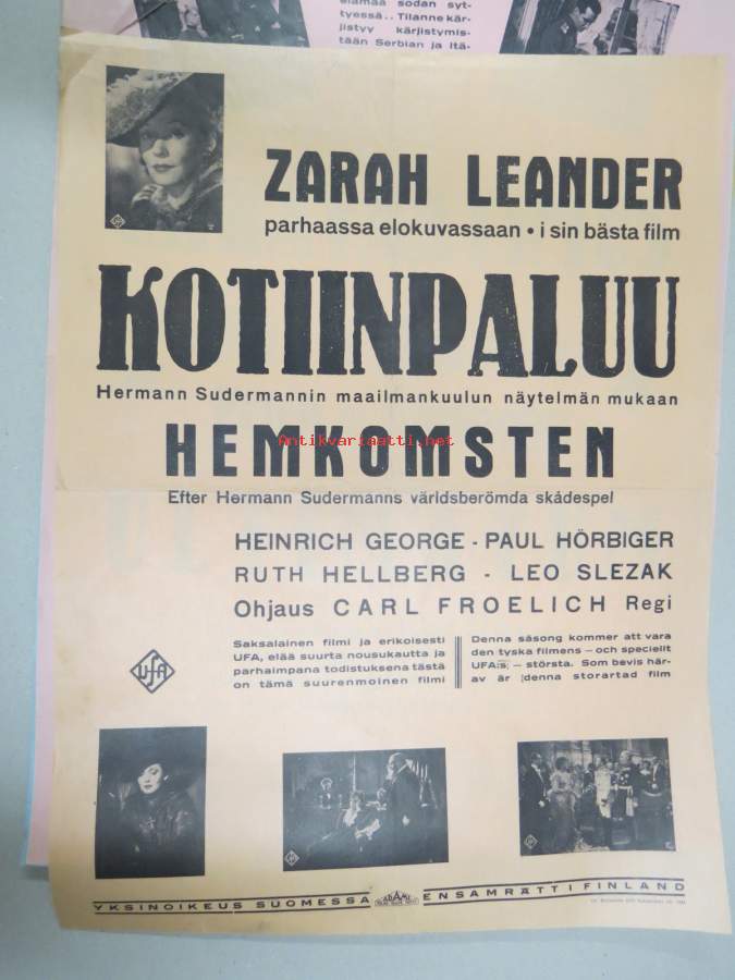 Kotiinpaluu - Zarah Leander 1941 -elokuvajuliste