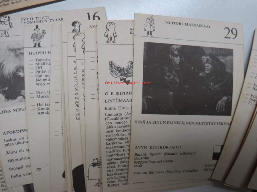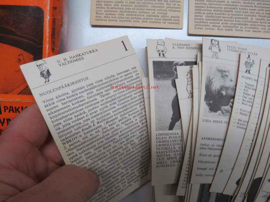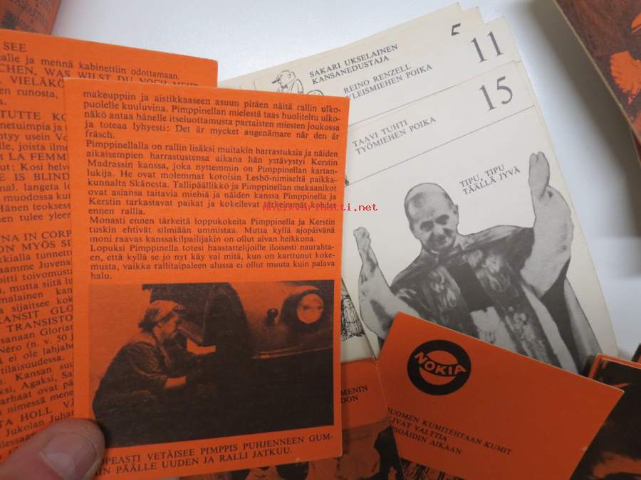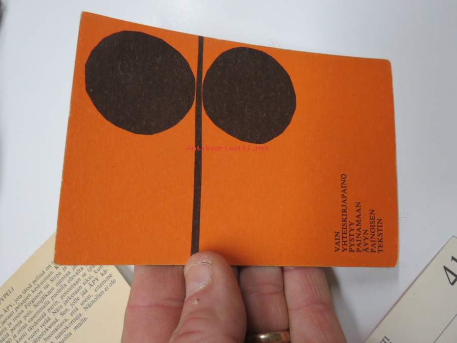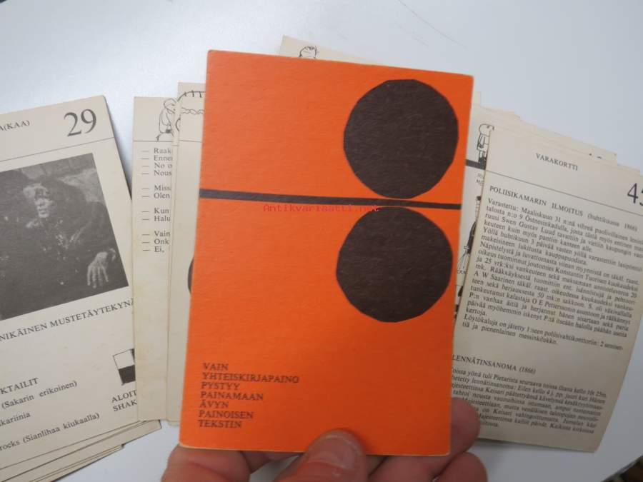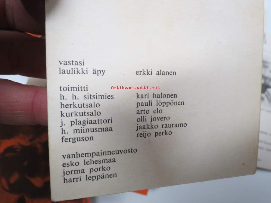 | Saatavilla | 1 kpl | | Julkaisuvuosi | 196? | | Kunto | K2 | | Sidonta/painoasu | Pienpainate | | Kielet | Suomi |