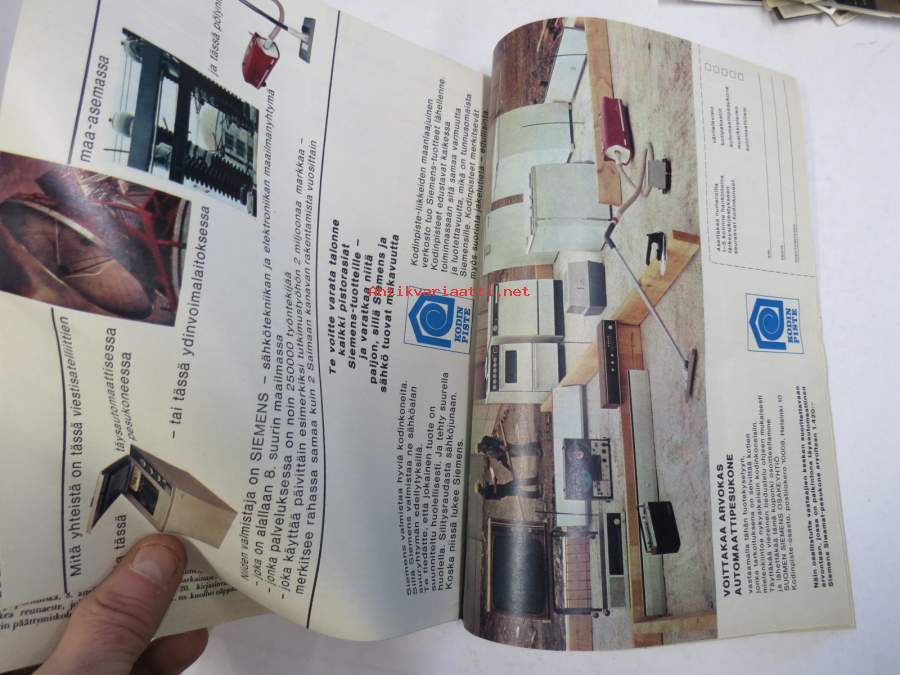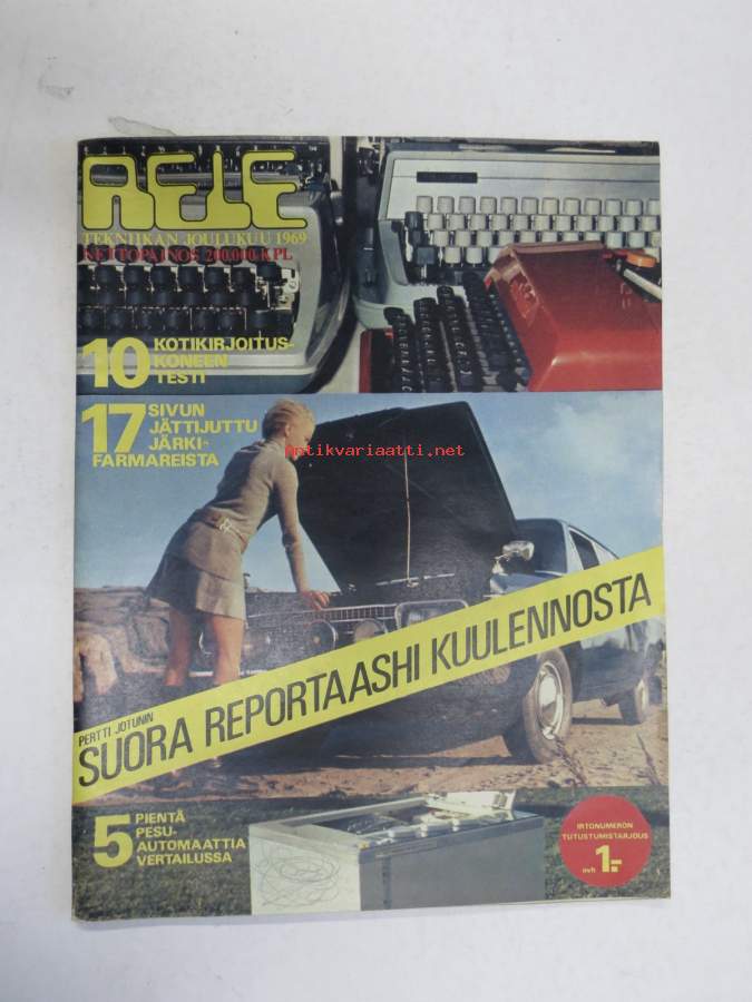 Tietolehdet, 1969Rele 1969 joulukuu -kuluttajavalistuksellinen tekniikan tietolehti, sis. mm. seur. artikkelit / kuvat / mainokset; 10 kotikirjoituskoneen testi, Järkifarmarit, Reportaashi kuulennosta, Peinet automaattipesukoneet vertailussa, Hiihtovaruste-esittely, Elite 1500 Cavalier, Sunbeam 900, ym. 20 x 27 cm lehti.