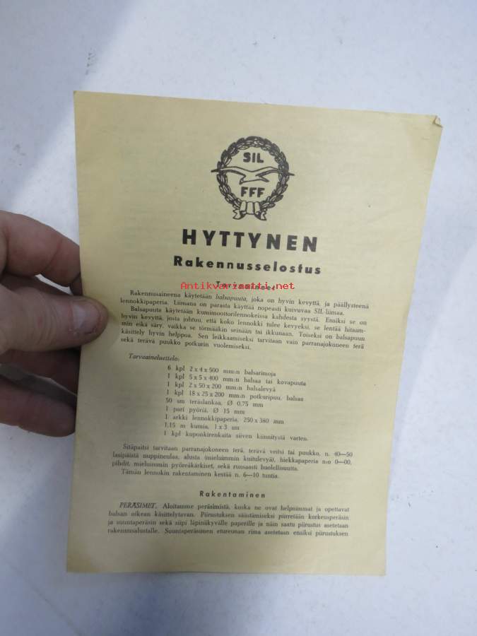 SIL - FFF Hyttynen rakennusselostus -lentokonepienoismallin rakentamisohje