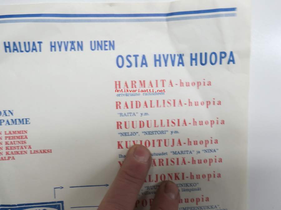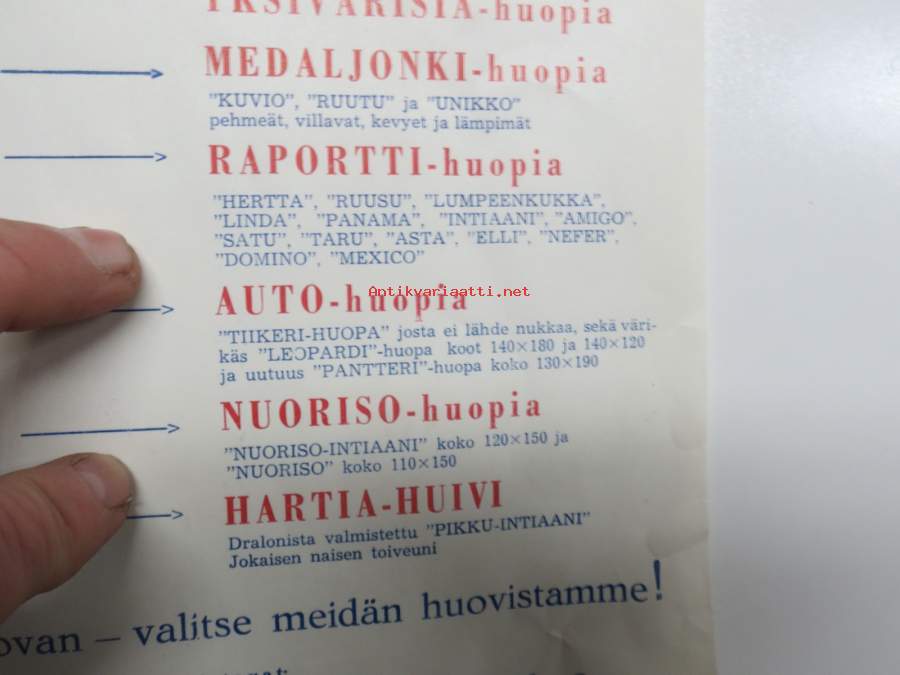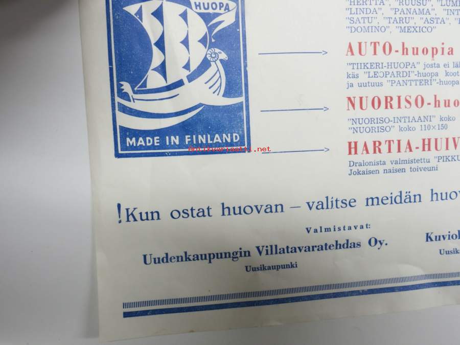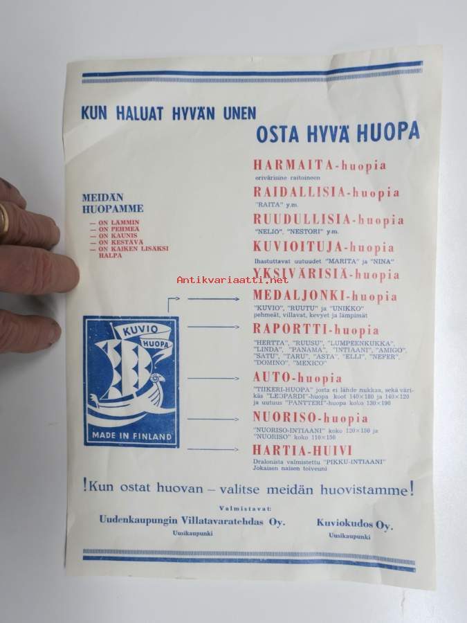 Uudenkaupungin Villatavaratehdas / Kuviokudos Oy - Huopia -myyntiesite