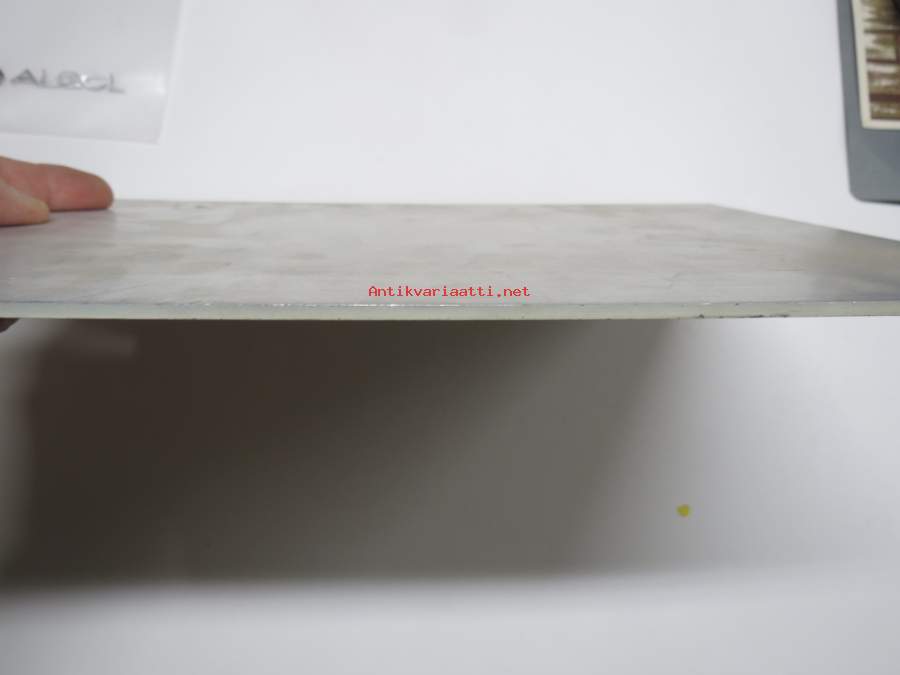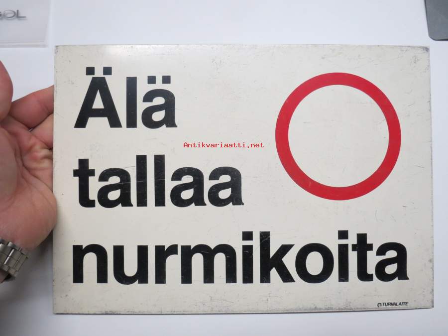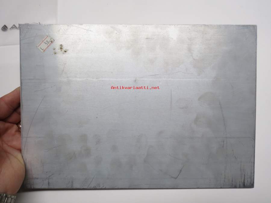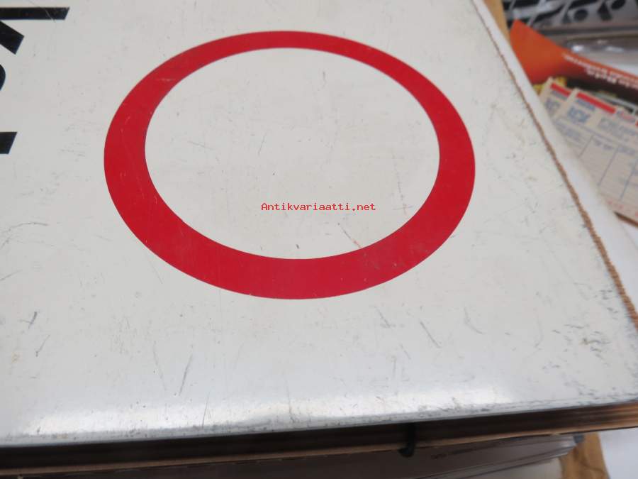 21 x 30 cm, 3 millin alumiinipeltiä, valmistaja Turvalaite Oy. Pinnassa kulumajälkiä, myymättä jäänyttä vanhaa varastoa, joten ei ole kiinnitetty koskaan mihinkään.