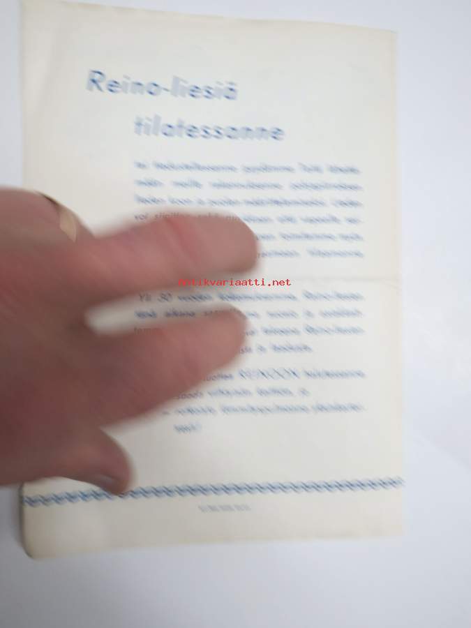 | Saatavilla | 1 kpl | | Sivuja | 4 | | Kunto | K3 | | Sidonta/painoasu | Pienpainate | | Kielet | Suomi |