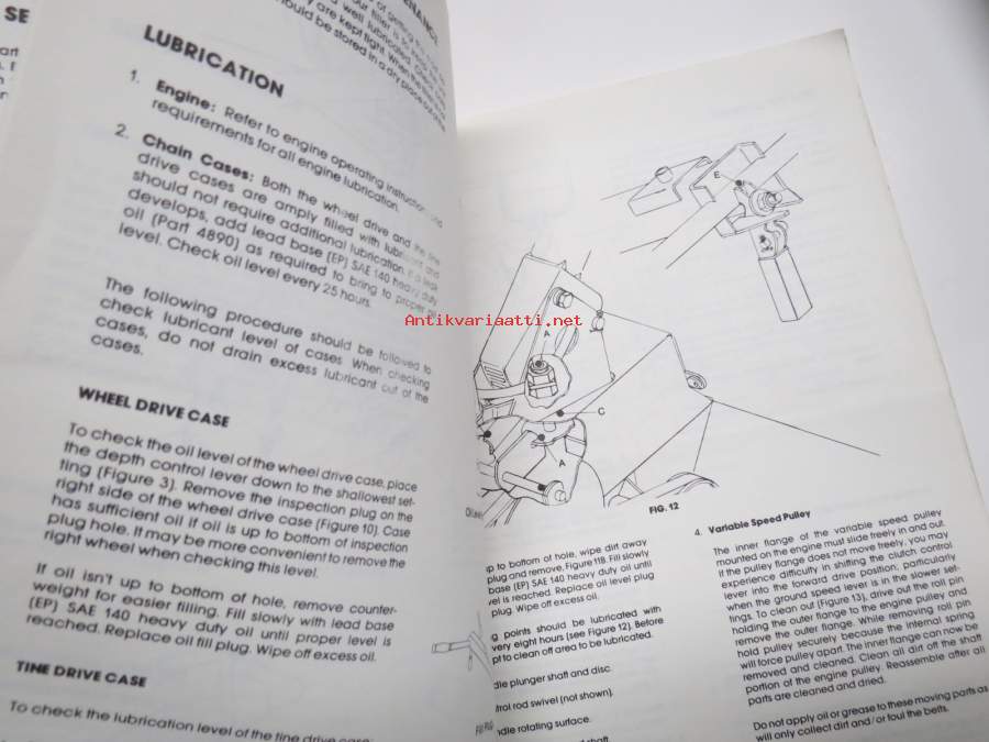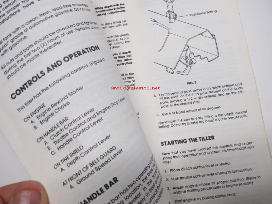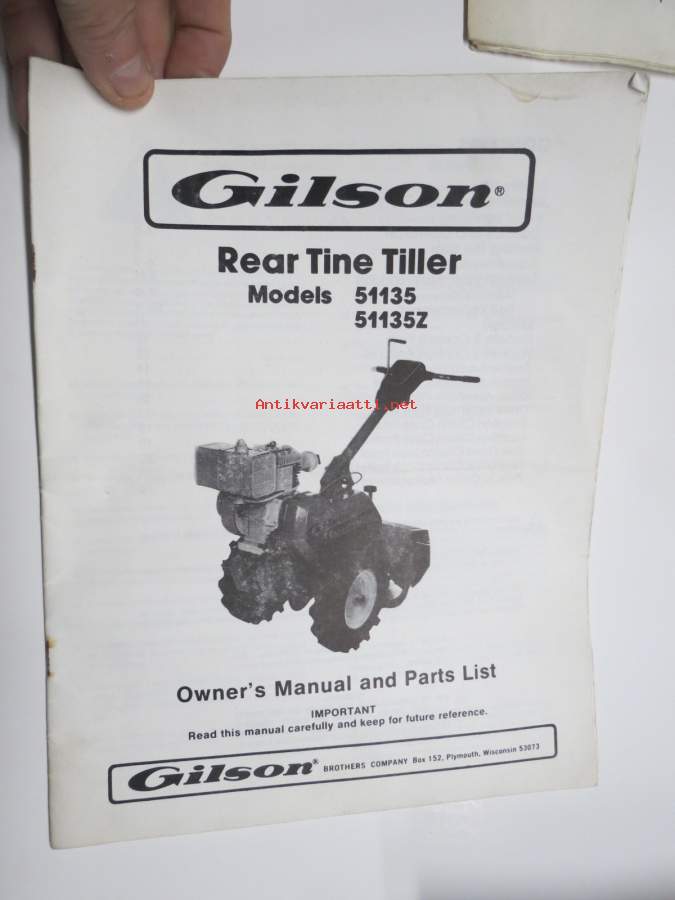 Gilson pyörävetoinen jyrsin - Rear Tine Tiller Models 51135, 51135Z - Owner´s Manual & Parts List -käytöohjekirja ja varaosaluettelo + suomenkielinen käännös