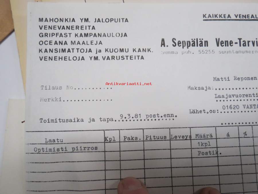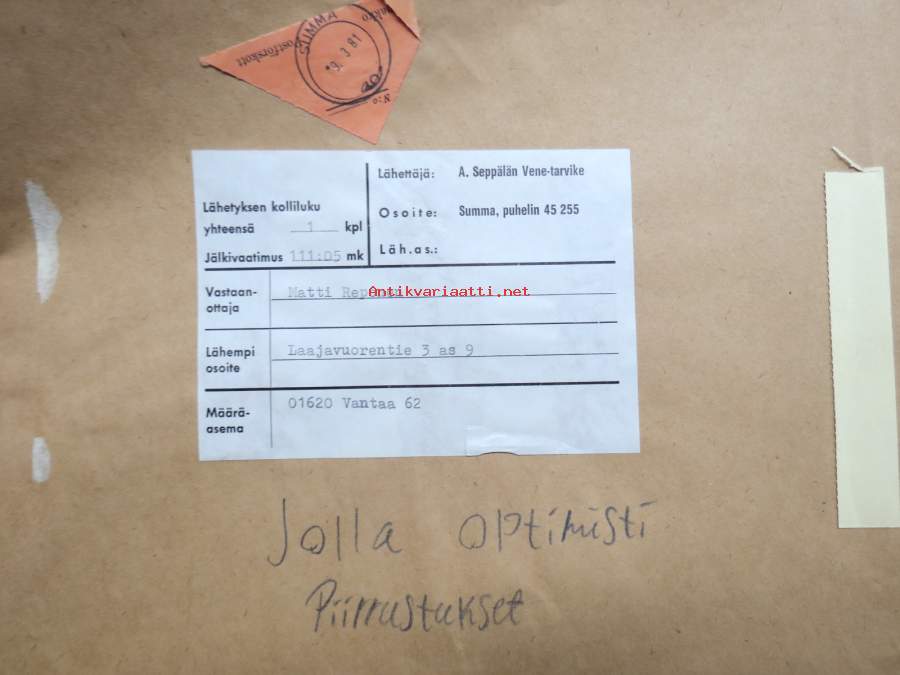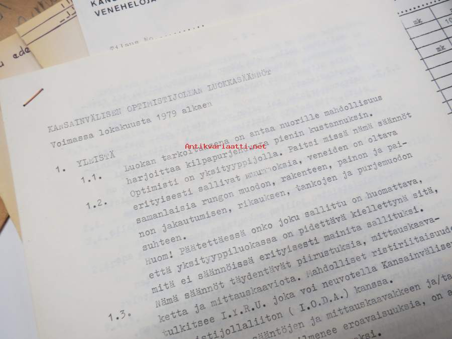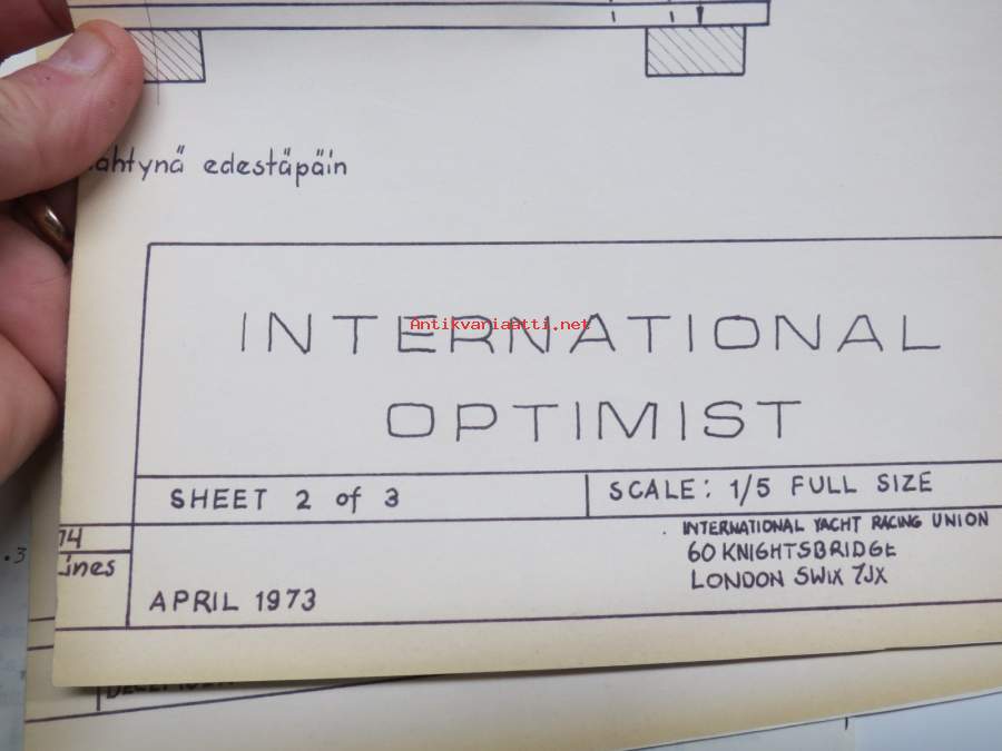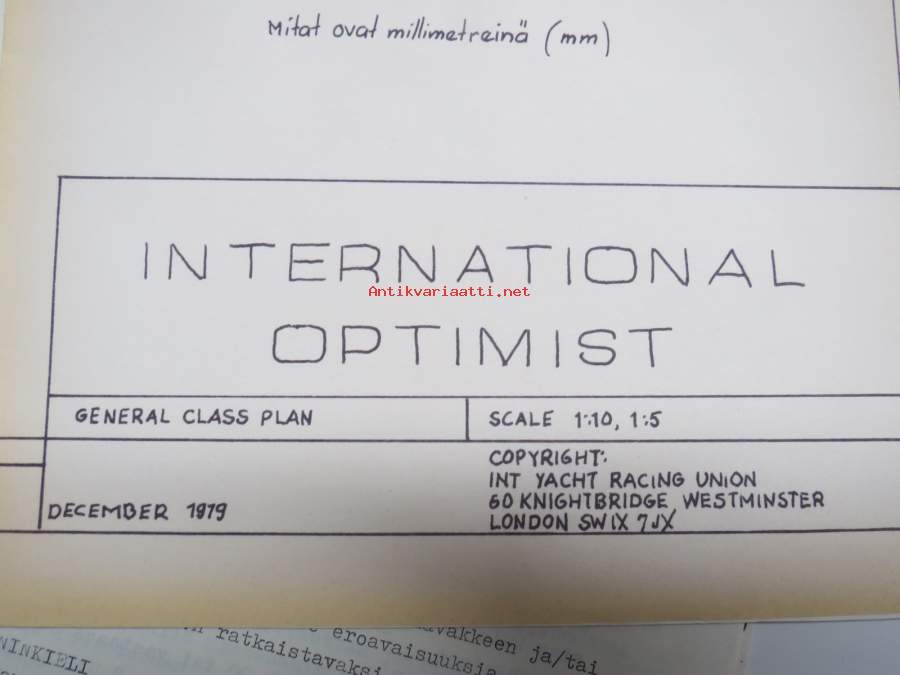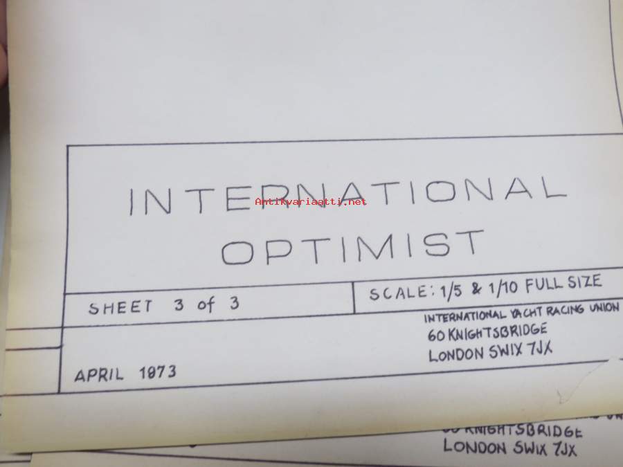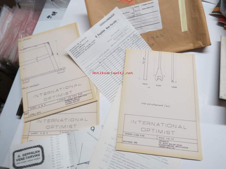Optimistijolla - International Optimist -jollan rakennuspiirustukset ym. siihen liittyvä painettua materiaali
