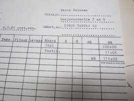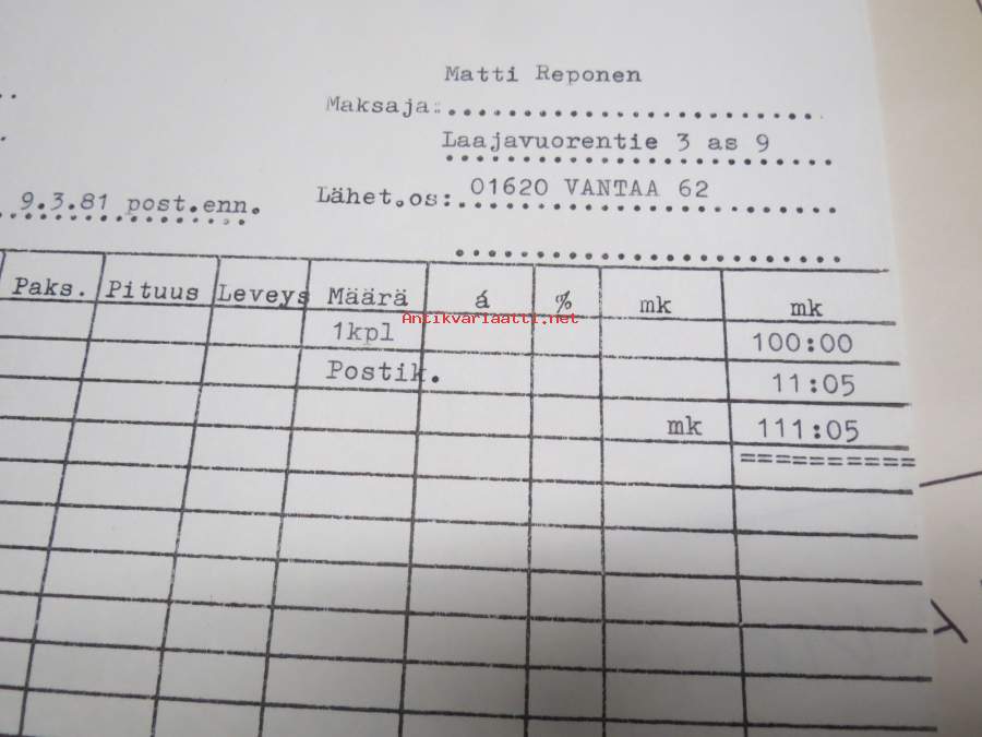 | Saatavilla | 1 kpl | | Kunto | K3 | | Sidonta/painoasu | Pienpainate | | Kielet | Suomi |