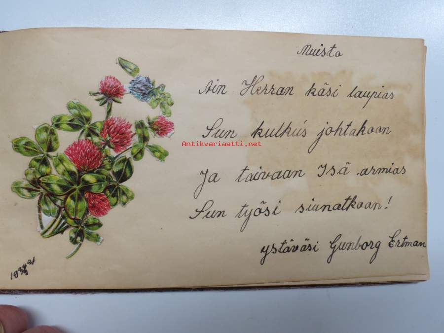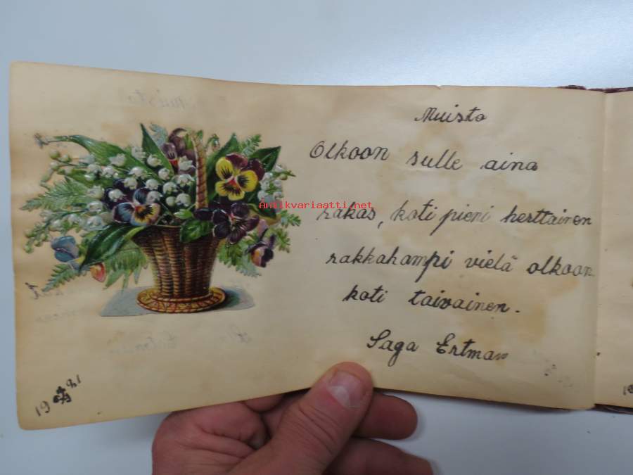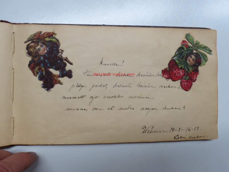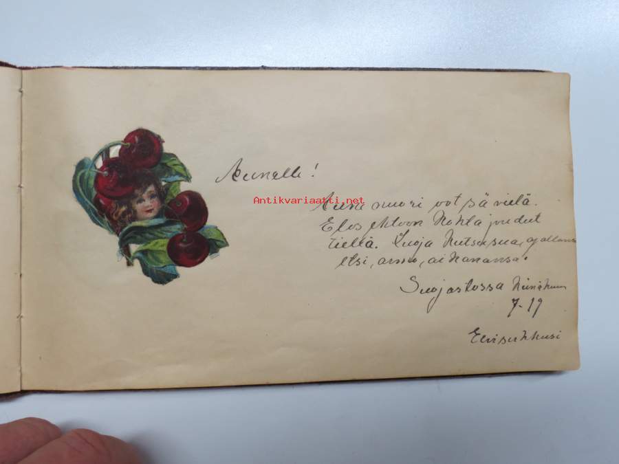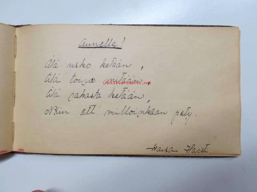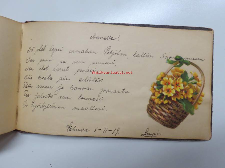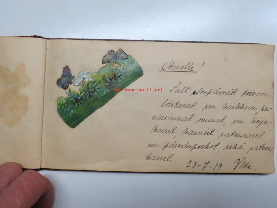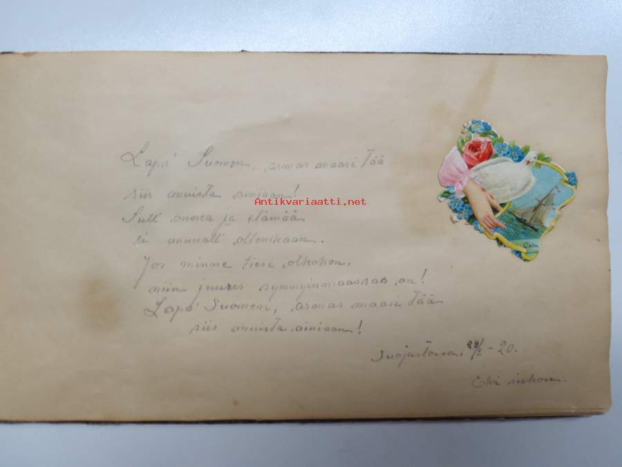Muistokirja - Aune Heleena Ruuth (Suojaasto, Vehmaa) -muistokirja kiiltokuvineen ja teksteineen vv. 1919-1923, runsaasti kiiltokuvia, kaikki näkyvät kohteen kuvista