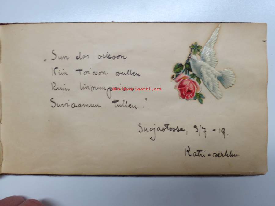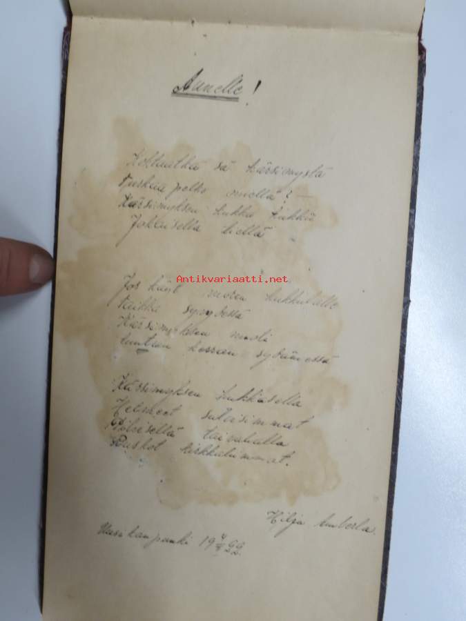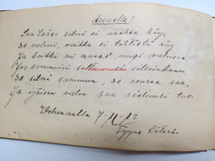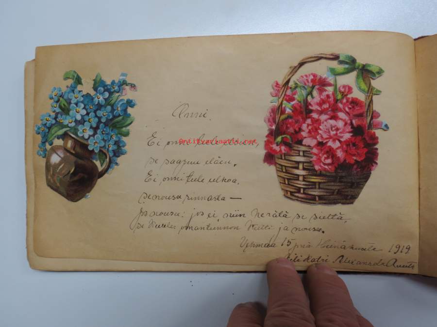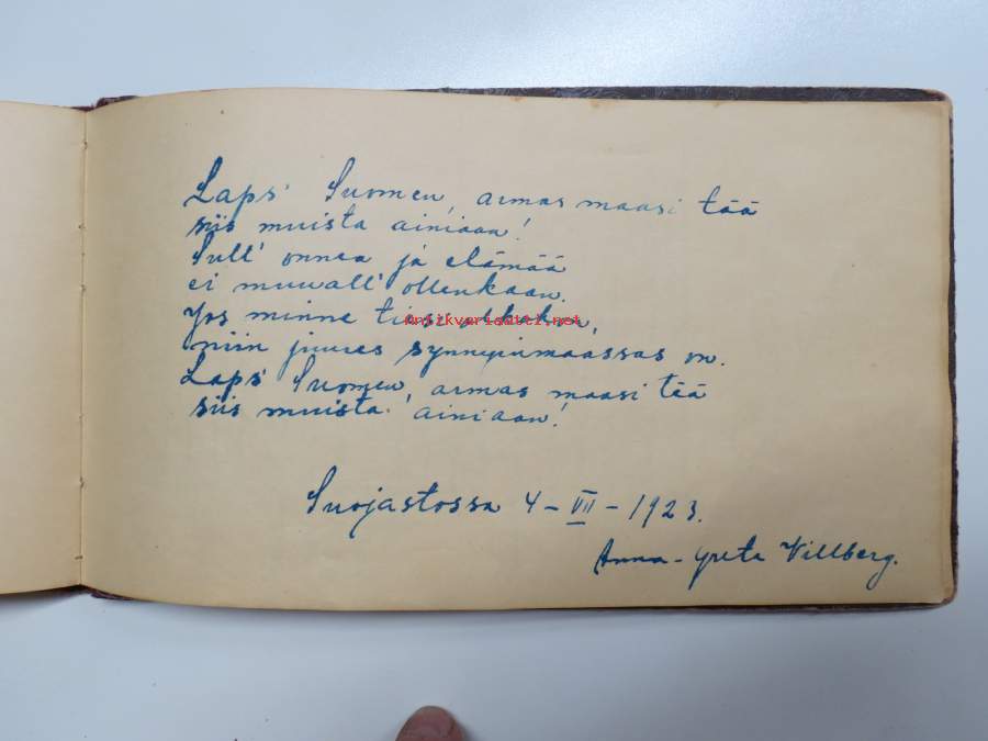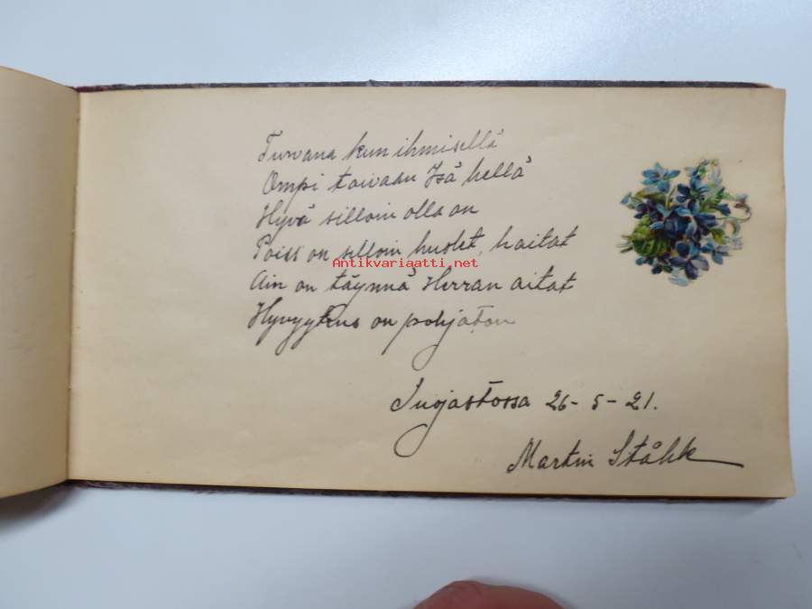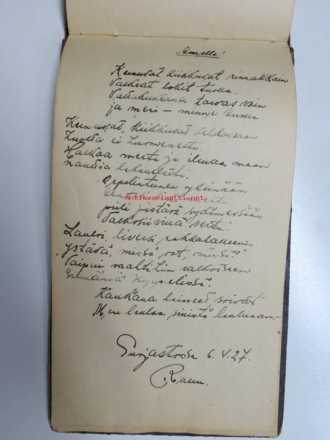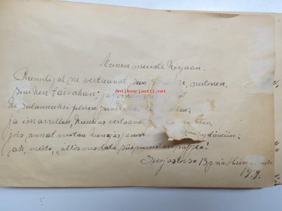 Muistokirja - Aune Heleena Ruuth (Suojaasto, Vehmaa) -muistokirja kiiltokuvineen ja teksteineen vv. 1919-1923, runsaasti kiiltokuvia, kaikki näkyvät kohteen kuvista