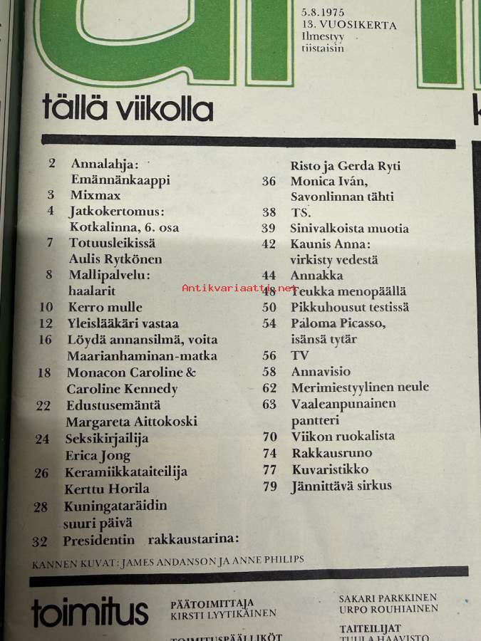 Anna 1975 nr 32, ilmestynyt 5.8.1975, Uma, Monacon Caroline ja Caroline Kennedy, Margareta Aittokoski, Erica Joni, Kerttu Horila