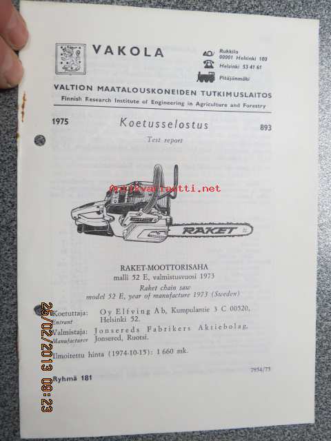 Raket 52 E Vakola koetusselostus 1975