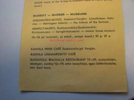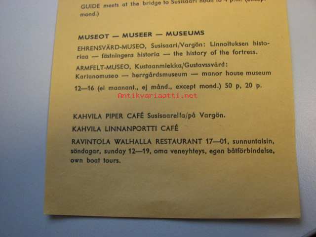 | Saatavilla | 1 kpl | | Julkaisuvuosi | 19?? | | Sivuja | 1 | | Kunto | K2 | | klemmarin jälki | | Kielet | Suomi, Ruotsi, Englanti |