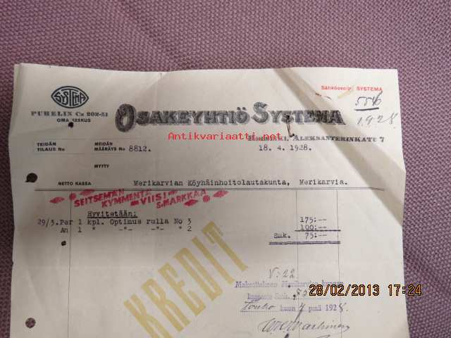 Oy Systema. Aleksanterinkatu 7, Hki 18.4.1928 hyvityskuitti