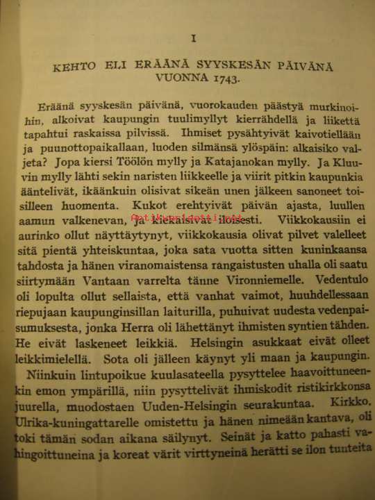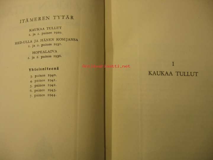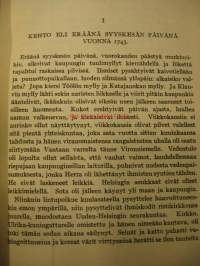 | Saatavilla | 1 kpl | | Julkaisuvuosi | 1944 | | Sivuja | 676 | | Painos | 7 | | Kunto | K3 | | kellastunut, jotkut sivut taittuneet | | Sidonta/painoasu | Taskukirja | | Kielet | Suomi |