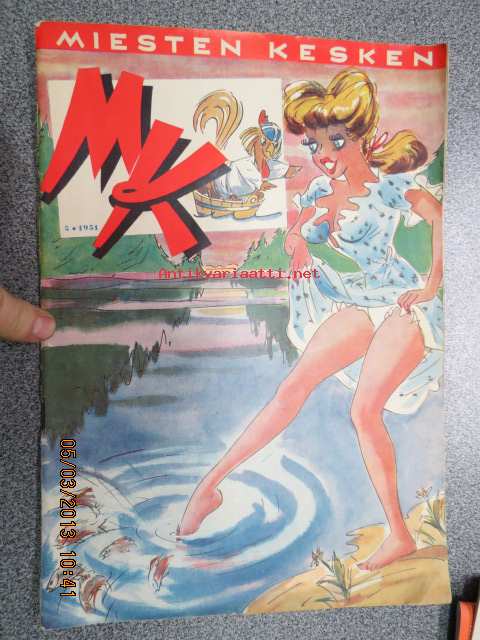 Miesten Kesken 1951 nr 5 -miehille suunnattu ajanvietelehti mm. artikkeli; Opiumsalakuljetusta kamelinvatsassa, Albert Einstein, Ympärileikkaus, Kevytmielinen
