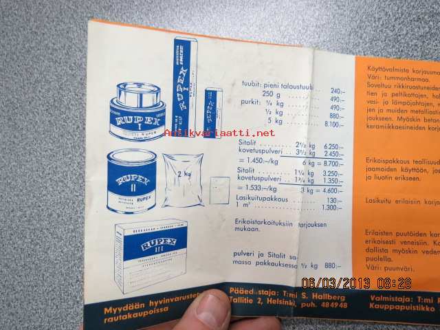 | Saatavilla | 1 kpl | | Sivuja | 4 | | Kunto | K2 | | Sidonta/painoasu | Pienpainate | | Kielet | Suomi |