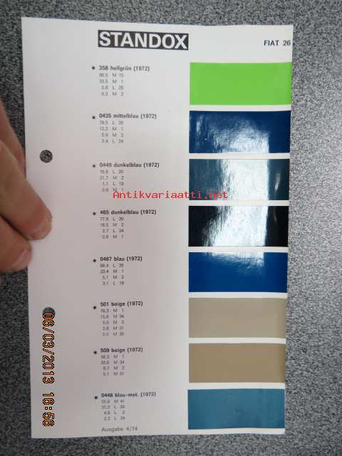 Standox Fiat 26 värimallit 1973/74 lisäykset mallikirjaan