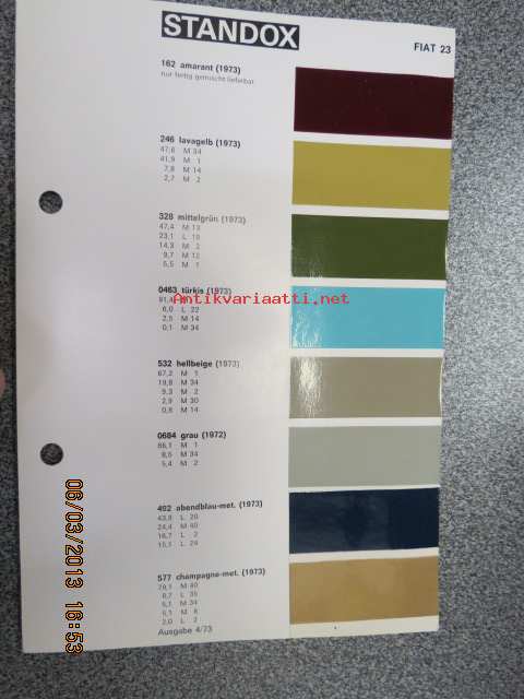 Standox Fiat 23 värimallit 1973/74 lisäykset mallikirjaan