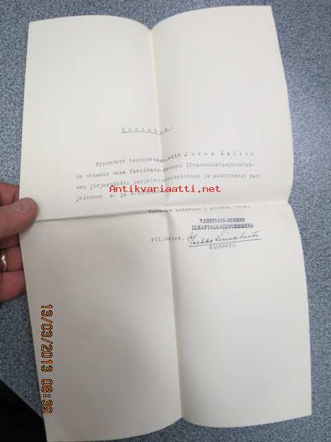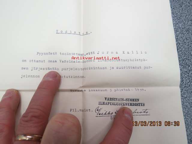 Todistus; pyynnöstä todistetaan, että Jorma Kallio on ottanut osaa Varsianis-Suomen Ilmapuolustusyhdistyksen purjelentotoimintaan ja suorittanut purjelennon A- ja B-tutkinnon... 1939