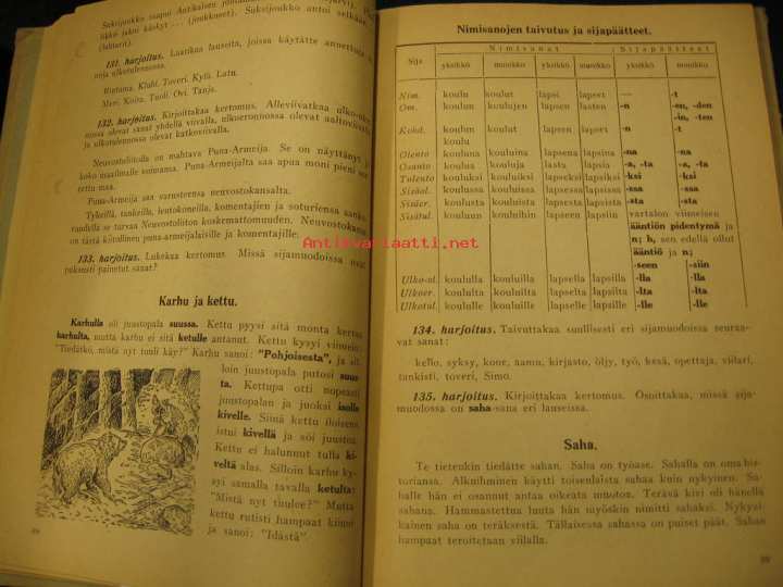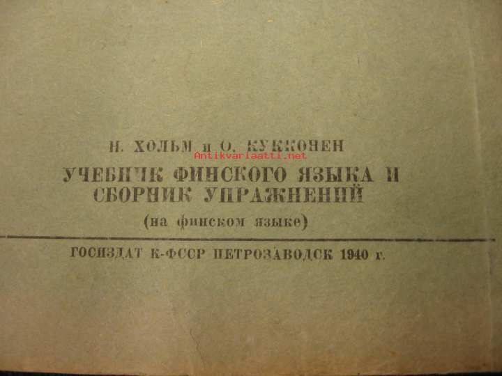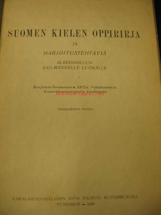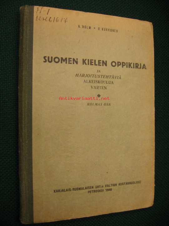 Holm N, Kukkonen O, Karjalais-Suomalaisen SNT.n valtion kust, 1940Uskomattoman propagandistinen sävy leimaa tätä viatonta suomenkielen oppikirjaa. Ensimmäinen painos, kuuluu ulkofennicaan.