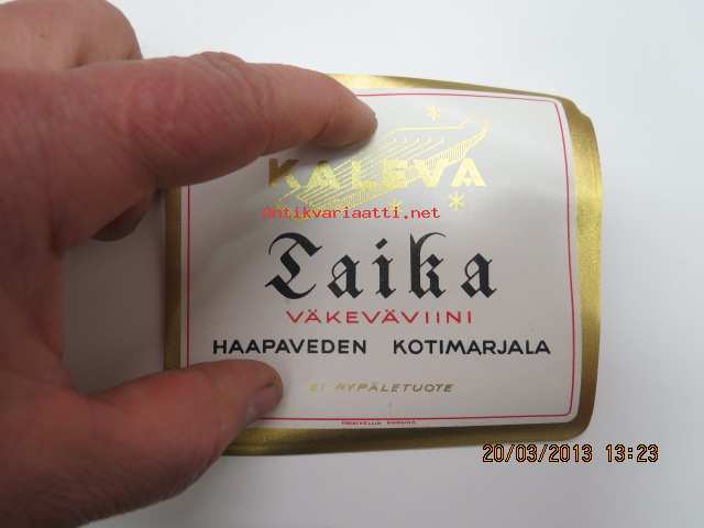 Kaleva Taika Väkeväviini Haapaveden Kotimarjala -viinaetiketti 1930-luku