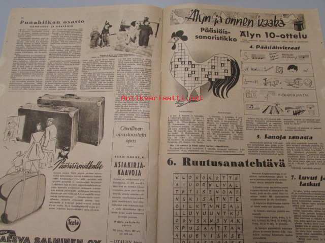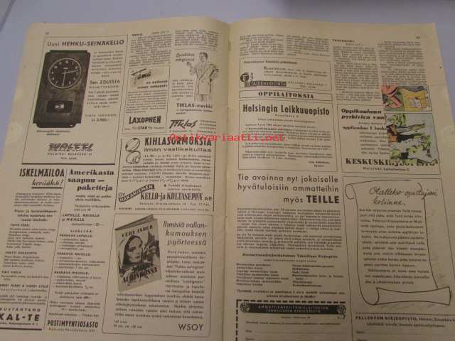 | Saatavilla | 1 kpl | | Julkaisuvuosi | 1946 | | Sivuja | 24 | | Kunto | K2 | | yksi ilmoitus leikattu pois | | Sidonta/painoasu | Lehti | | Kielet | Suomi |