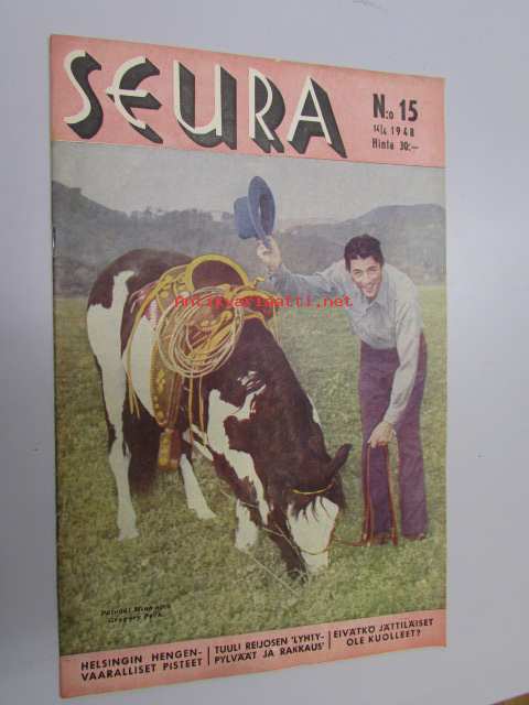 Seura 14. 4. 1948 nr 15 sis. mm. seur. artikkelit / kuvat / mainokset; Gregory Peck ja Eine Kukkonen, keilailu, Lola Montez, Helsingin liikenneonnettomuudet, Kelko Oy -mainos
