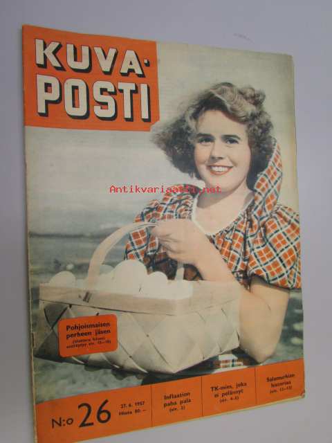 Kuvaposti 27. 6. 1957 nr 26 sis. mm. seur. artikkelit / kuvat / mainokset; inflaatio, TK-valokuvaaja Nils Helander, vuosisadan salamurhat, Voitto Hellsten, Jyväs-Hyvä -mainos