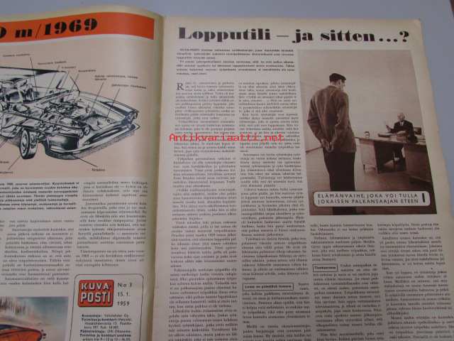 Valiolehdet Oy, 1959Kuvaposti 15. 1. 1959 nr 3 sis. mm. seur. artikkelit / kuvat / mainokset; lopputilin saaminen, Pelastusarmeija, Edwardin ajan pin-up-tytöt, ilmansaasteet, Viri-vanukas -mainos