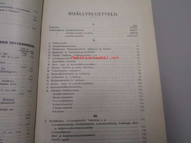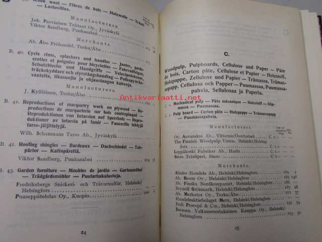 | Saatavilla | 1 kpl | | Julkaisuvuosi | 1924 | | Painos | 1. | | Kunto | K3 | | Sidonta/painoasu | Sidottu (kovak.) | | Kielet | Suomi, Saksa, Englanti, Ruotsi, Ranska |