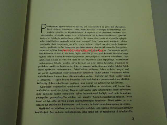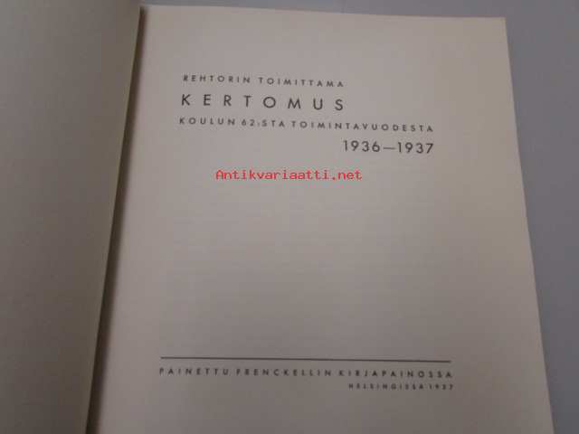 | Saatavilla | 3 kpl | | Julkaisuvuosi | 1937 | | Painos | 1. | | Kunto | K3 | | Sidonta/painoasu | Nidottu (pehmeäk.) | | Kielet | Suomi |