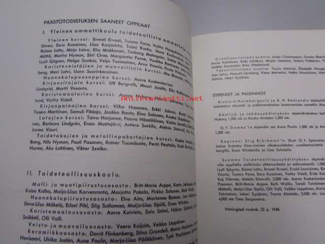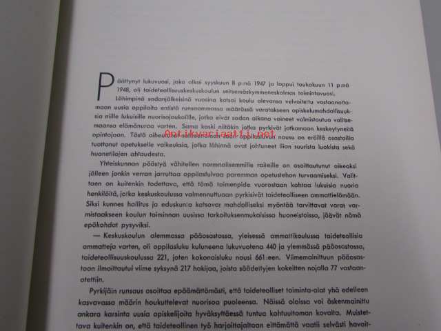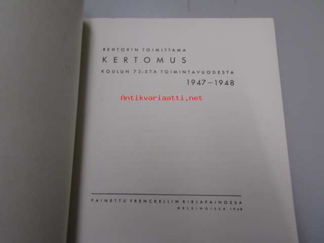 | Saatavilla | 2 kpl | | Julkaisuvuosi | 1948 | | Painos | 1. | | Kunto | K3 | | Sidonta/painoasu | Nidottu (pehmeäk.) | | Kielet | Suomi |