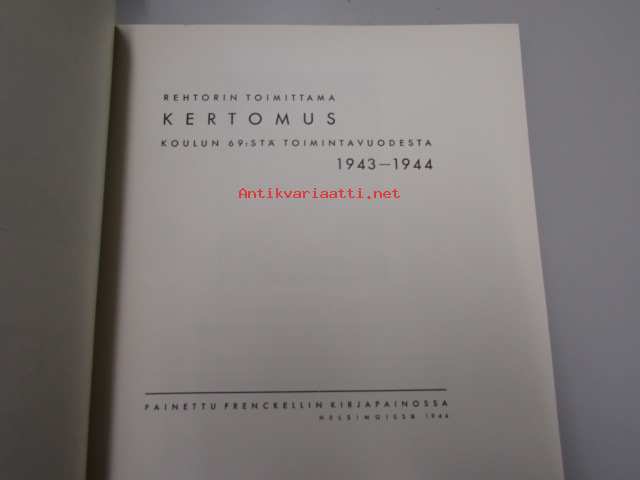 | Saatavilla | 1 kpl | | Julkaisuvuosi | 1944 | | Painos | 1. | | Kunto | K3 | | Sidonta/painoasu | Nidottu (pehmeäk.) | | Kielet | Suomi |