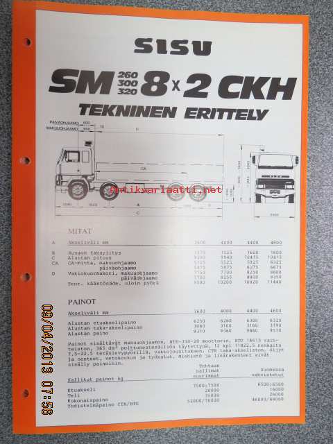 Sisu SM 260 300 320 CKH 8 x 2 tekninen erittely -myyntiesite