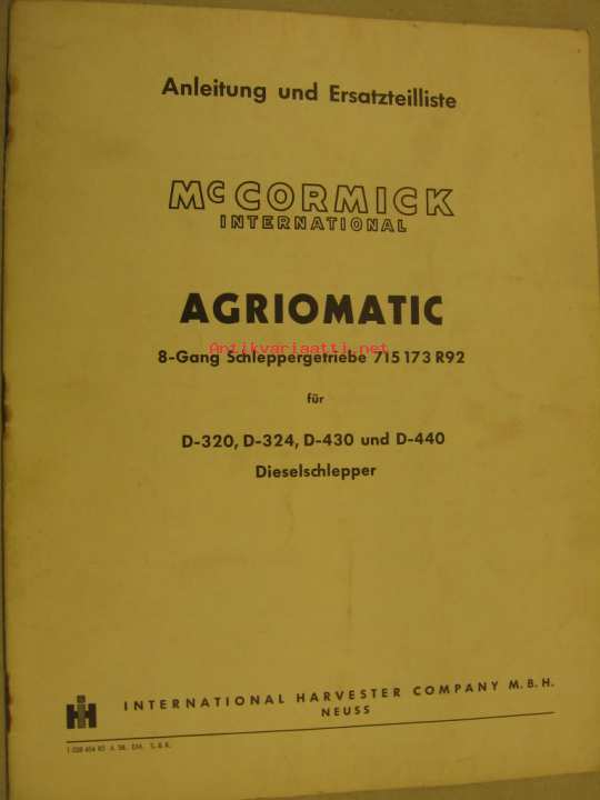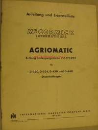 International Harvester Co , 1958Agriomatic -vaihteiston käyttöohjekirja ja varaosaluettelo.