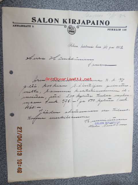 Salon Kirjapaino, Salo, 14.2.1922 / Herra Hämäläinen, Sauvon ja Karunan Osuusmeijeri -asiakirja