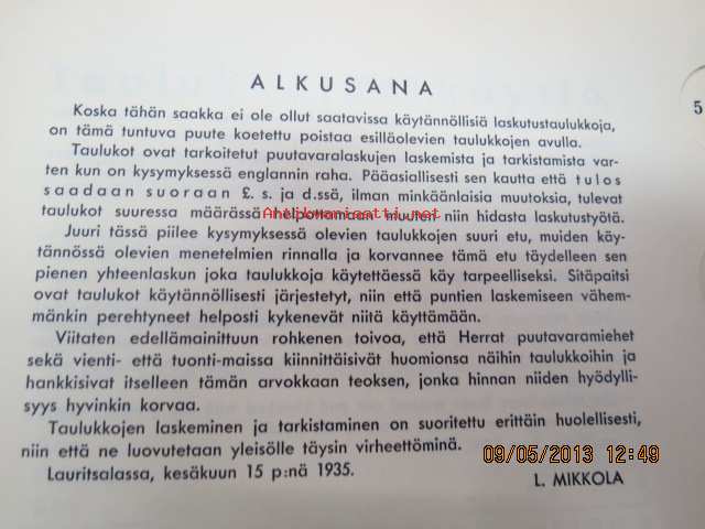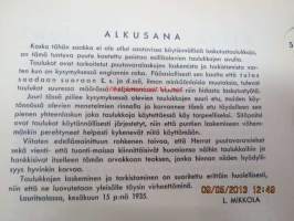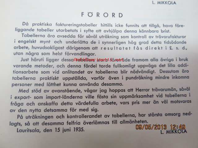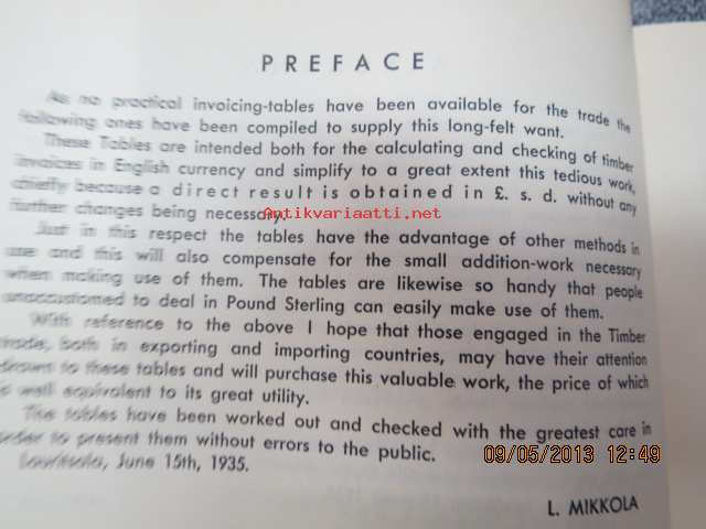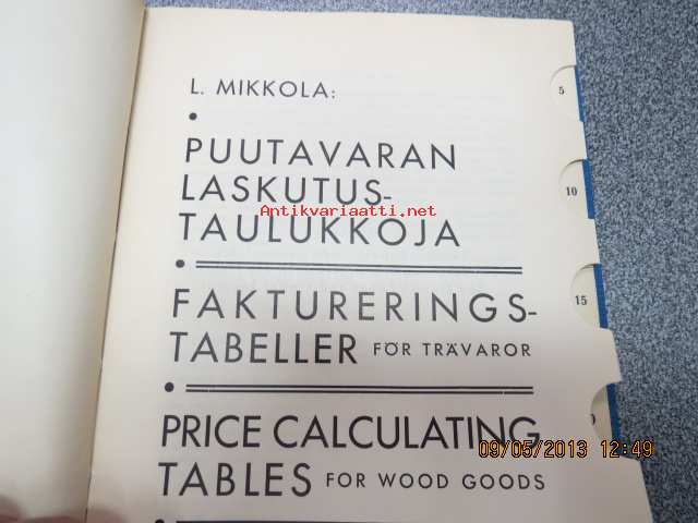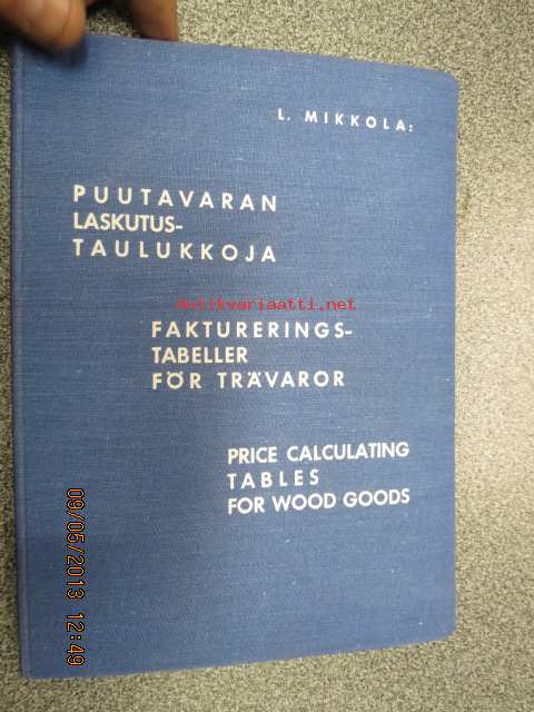 Mikkola L., Suomen Paperi- ja Puutavaralehti, 193516 x 22 cm, puutavarakauppiaiden ja agentuurien käyttöön tarkoitettu taulukkokirja nopeaan hinnoitteluun.