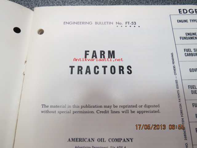 Standard Oil Division American Oil Company Engineering Bulletin "Farm Tractors" - öljy-yhtiön kustantama traktorien huoltoon liittyvää teknistä tietoutta sisältävä julkaisu