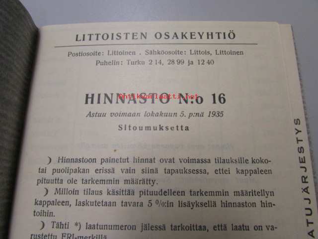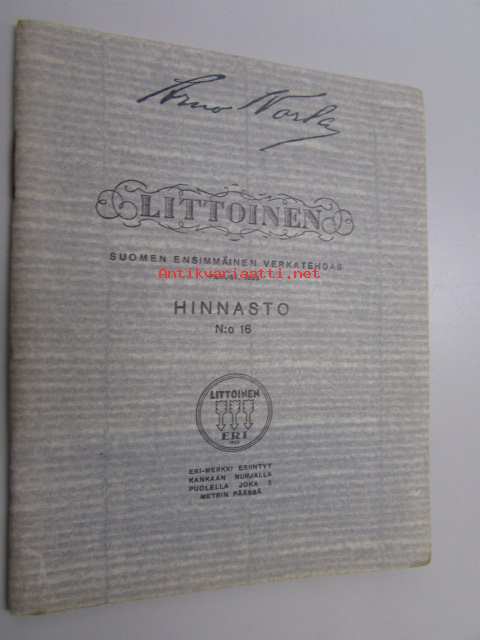 Littoinen Oy verkatehdas hinnasto nr 16 (Arno Norla?)