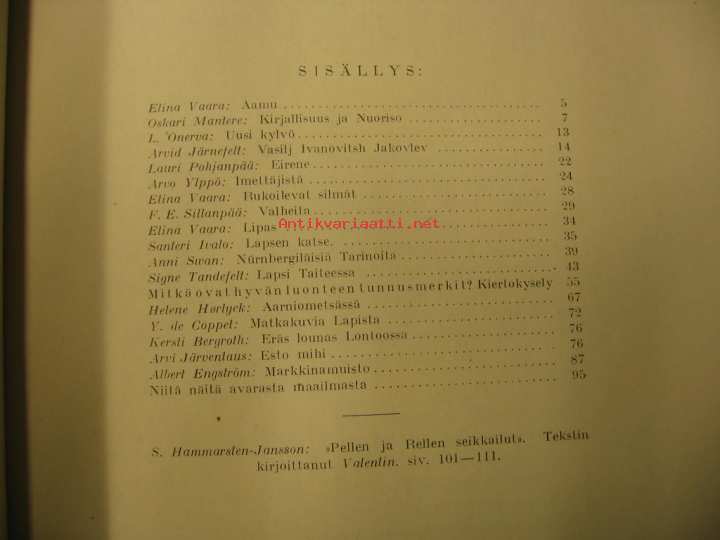 Sis mm. Elina Vaaran, FE Sillanpään, L Onervan, Arvo Ylpön kertomuksia. Ks sisällysluettelo kuvista. Mv valokuvia. Lopussa n 30 sivua hienoja mv mainoksia, yleensä 4 mainosta / sivu. Mallikuvassa kirjan suurin / hienoin mainos.