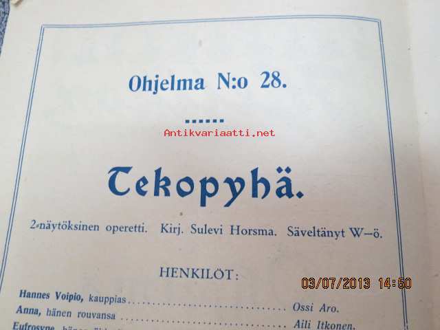 Helikon, Kluuvikatu 2, Helsinki elokuva- / operettiteatteri - Ohjelma nr 28 Tekopyhä (operetti) -käsiohjelma