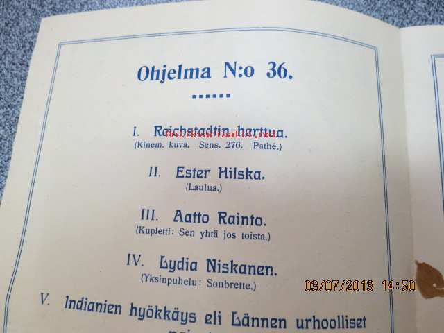 Helikon, Kluuvikatu 2, Helsinki elokuva- / operettiteatteri - Ohjelma nr 36 mm. Reichstadtin herttua - Pathé elokuva, Perheen toivo ja kiusa - Gaumont elokuva, Indianien hyökkäys - Yanke -elokuva -käsiohjelma