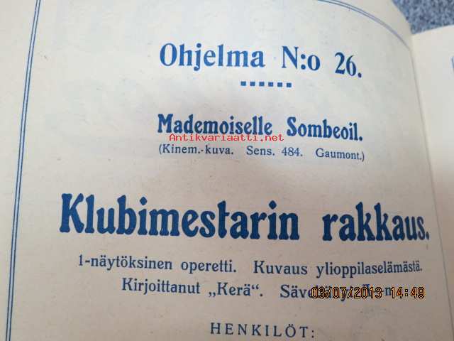 Helikon, Kluuvikatu 2, Helsinki elokuva- / operettiteatteri - Ohjelma nr 26 mm. Madamoiselle Sombeoil kinematorgrafinen kuva, sensuuri 484, Gaumonto-elokuva,