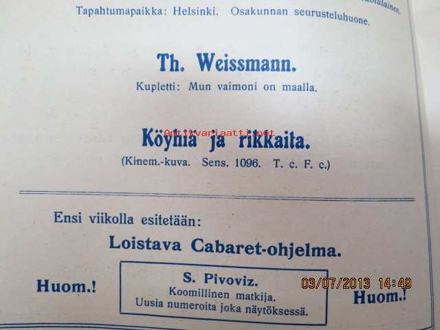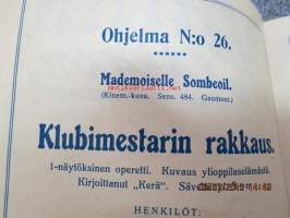 Helikon, Kluuvikatu 2, Helsinki elokuva- / operettiteatteri - Ohjelma nr 26 mm. Madamoiselle Sombeoil kinematorgrafinen kuva, sensuuri 484, Gaumonto-elokuva, Lubimest. rakkaus operetti, S. Pivovits -