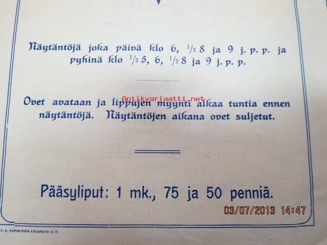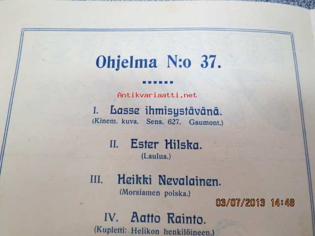 Helikon, Kluuvikatu 2, Helsinki elokuva- / operettiteatteri - Ohjelma nr 37 mm. Lasse ihmisystävänä -kinematografinen kuva, sensuuri nr 627 Gaumont-filmi,