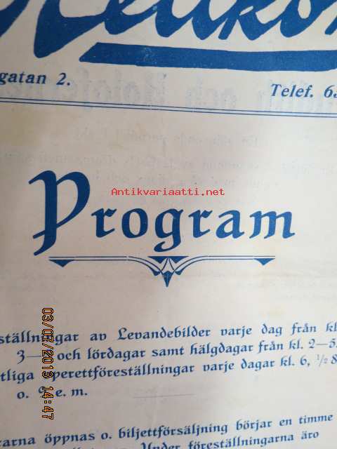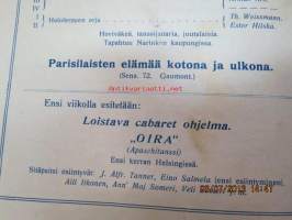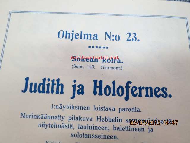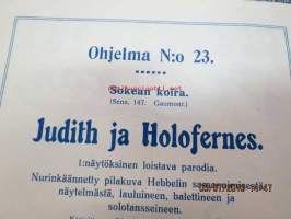 Helikon, Kluuvikatu 2, Helsinki elokuva- / operettiteatteri - Ohjelma nr 23 mm. Sokean koira -kinematografinen kuva, sensuuri nr 147 Gaumont-filmi, Judith ja Holofernes operetti -käsiohjelma